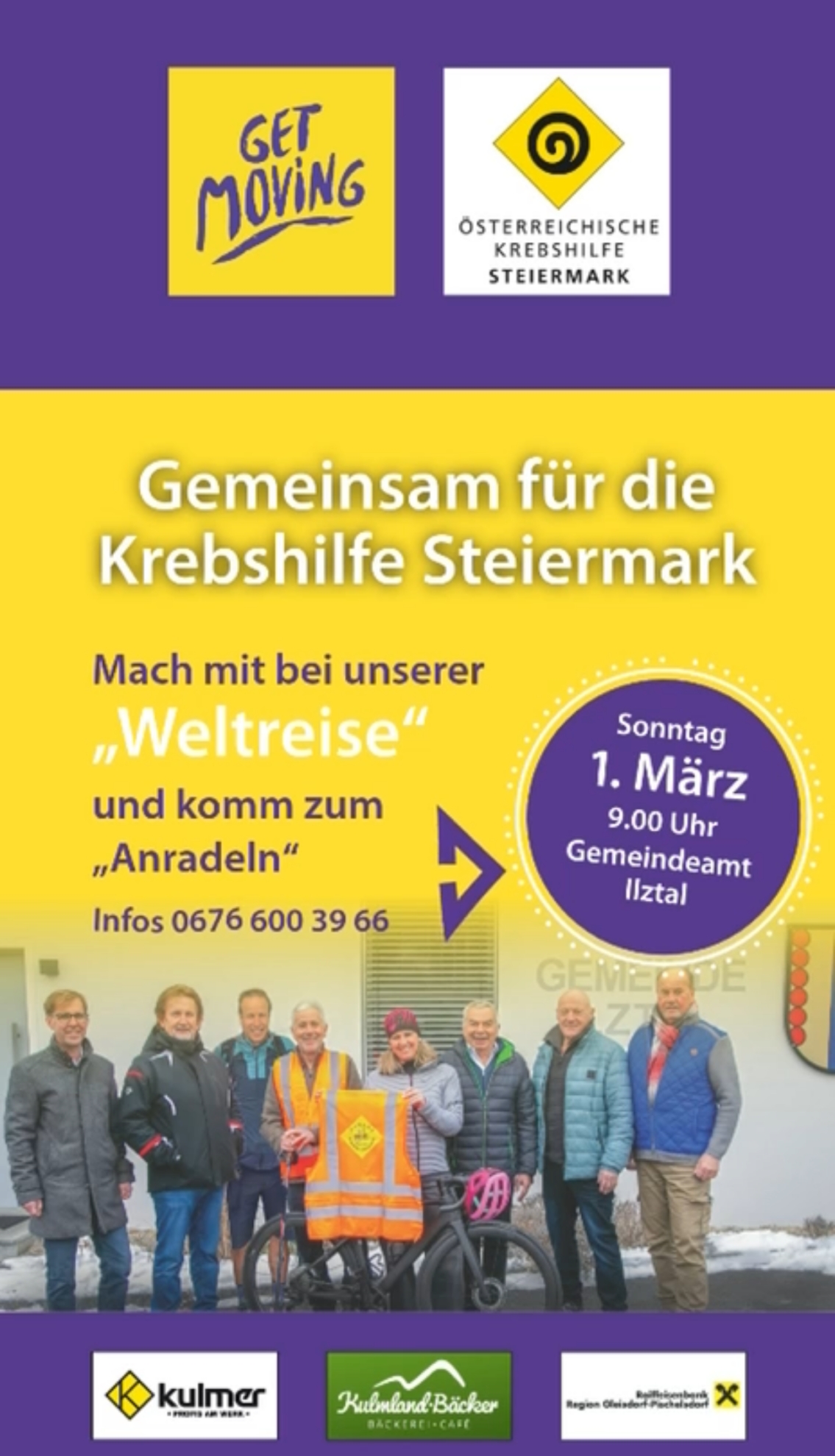 Unter dem Motto „Get Moving!“ startet im Ilztal ein besonderes Spendenprojekt zugunsten der Krebshilfe Steiermark. Ziel ist es, gemeinsam aktiv einmal die Welt zu umrunden.